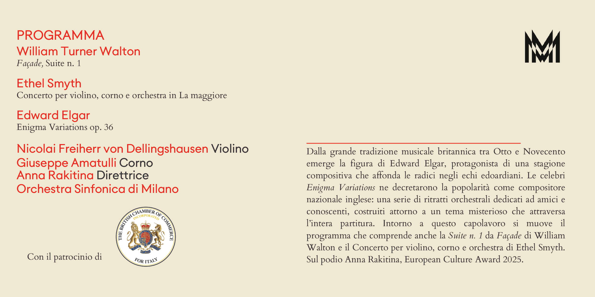 fri20mar8:00 pm10:00 pmStagione Sinfonica | Concerto WALTON / SMYTH / ELGAREvent organized by Orchestra Sinfonica di Milano with the patronage of The British Chamber of Commerce for Italy